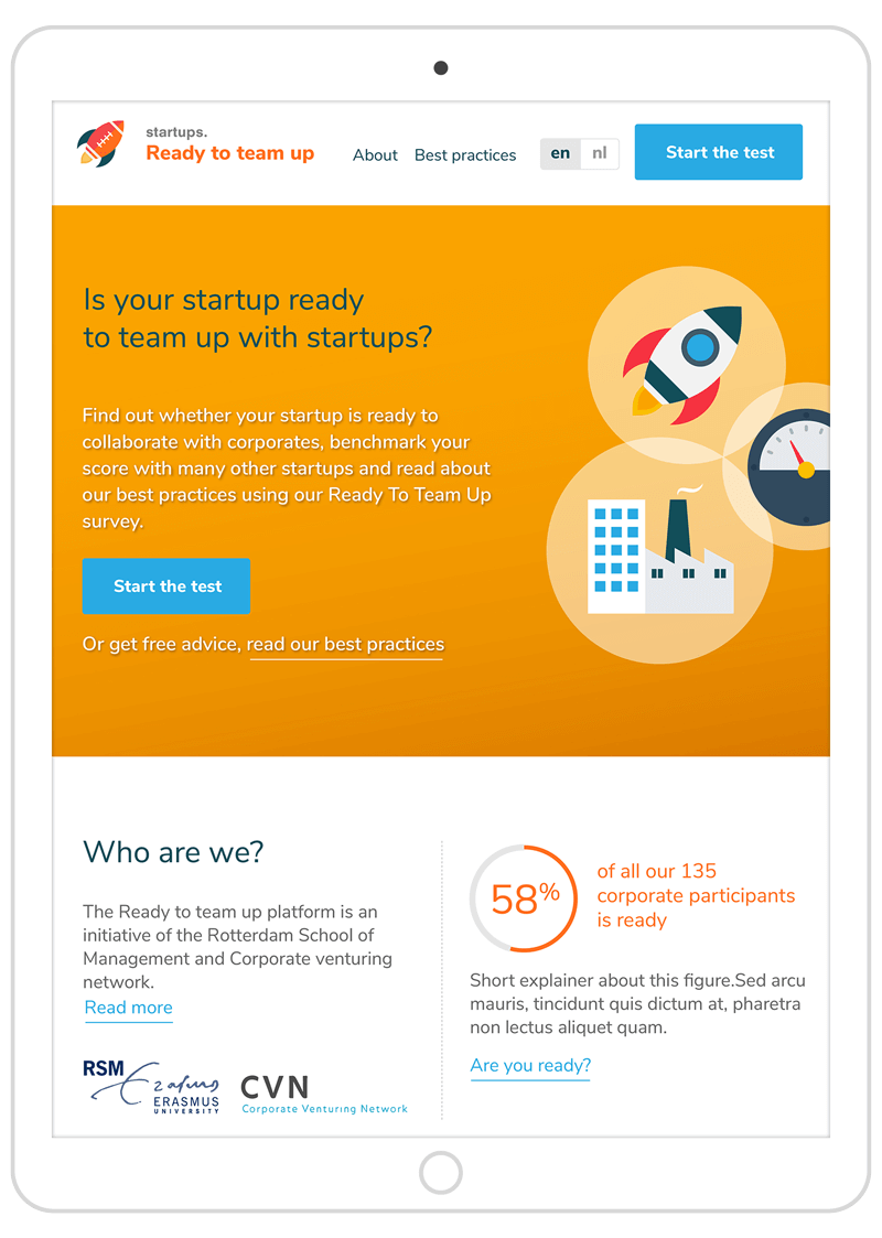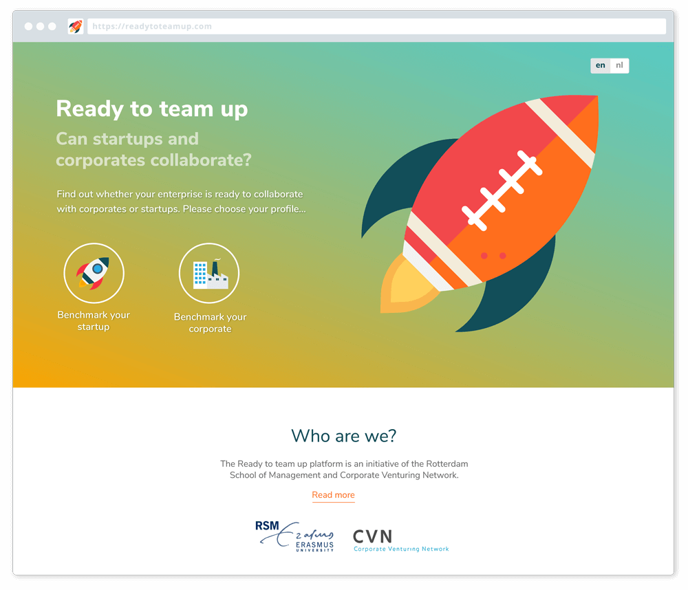 Samen met de Erasmus Universiteit ontwikkelden wij de onderzoekstool "ReadyToTeamUp" t.b.v. haar onderzoek naar startup-corporate samenwerking.