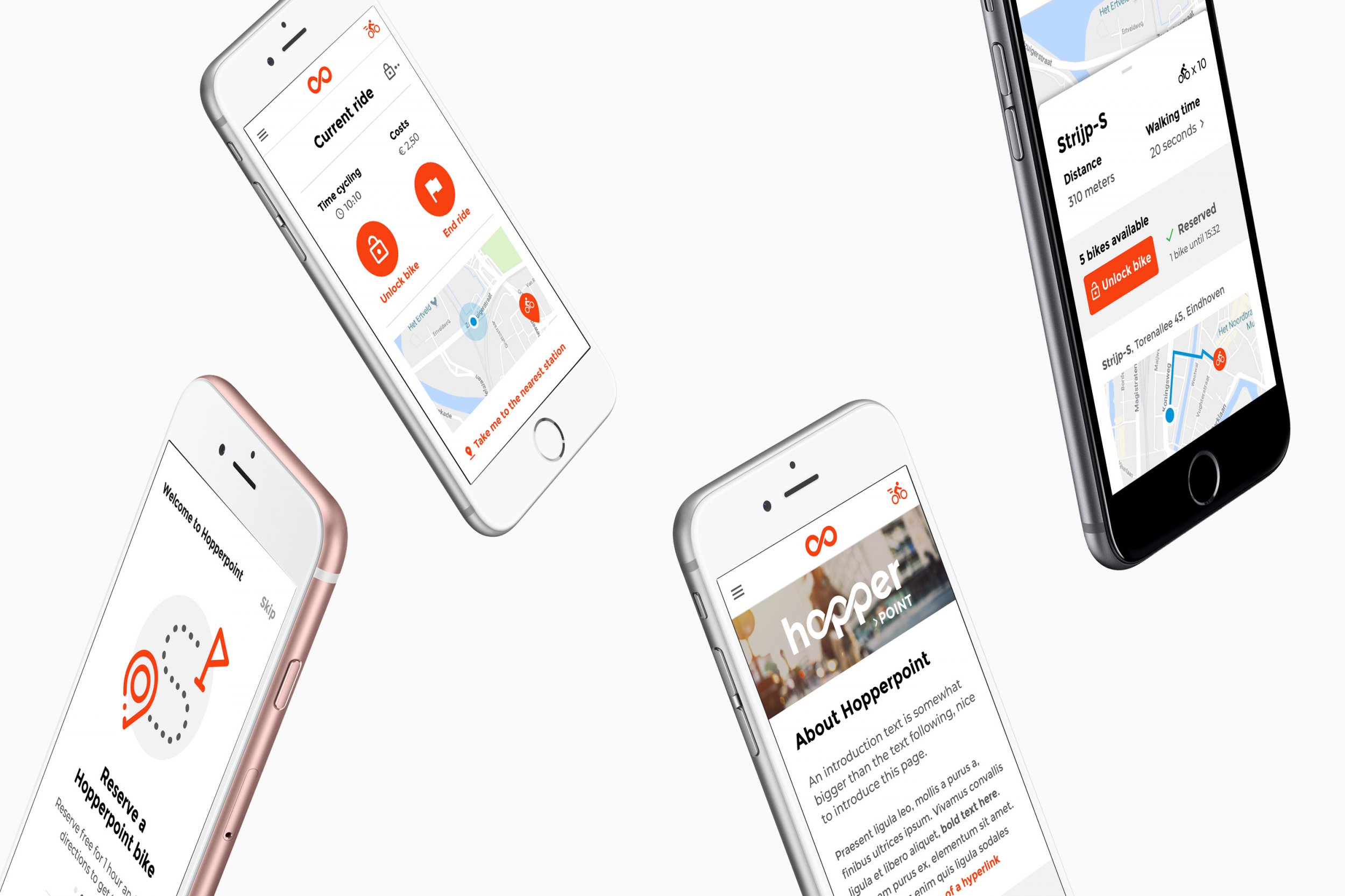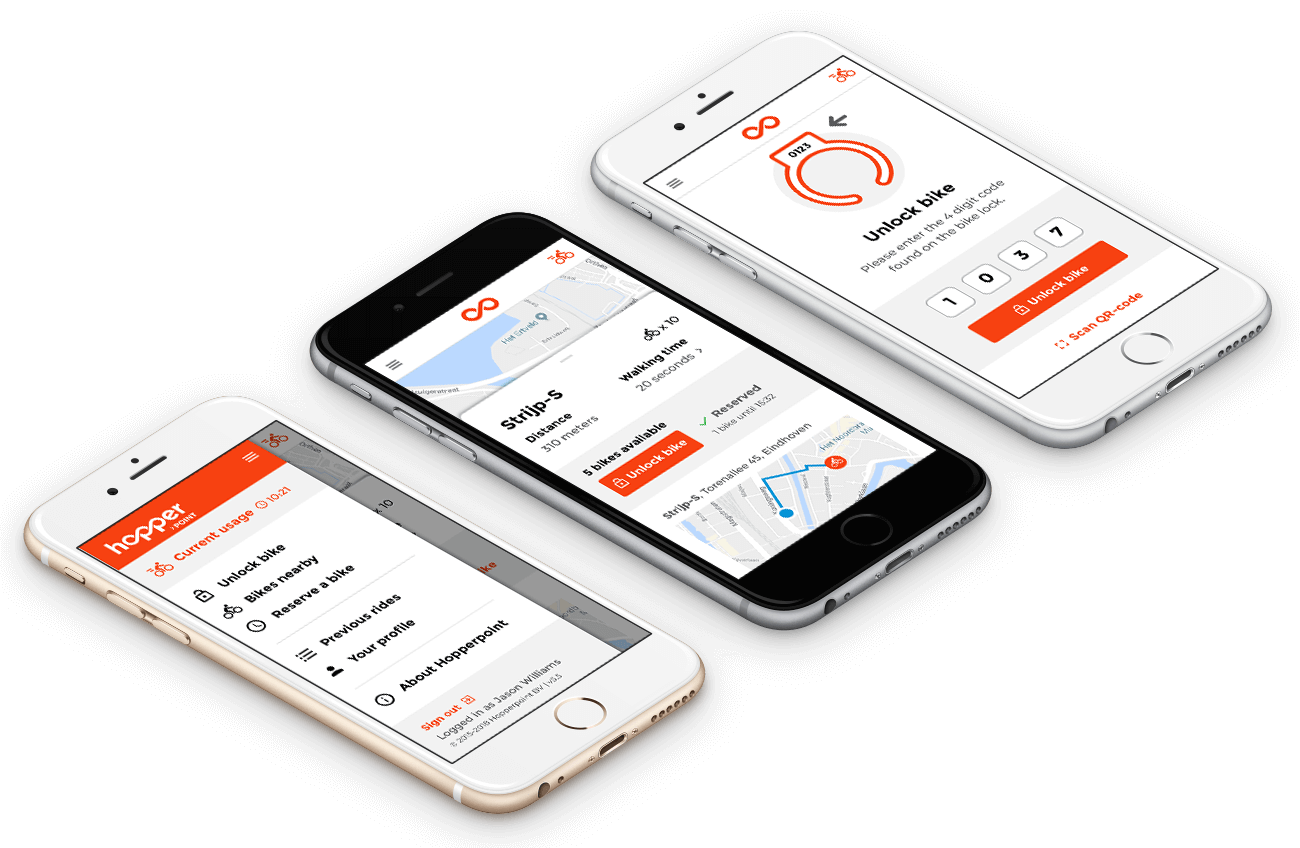 Hopperpoint breidt uit, met meer fietsen, steden en slimme sloten, daarom werden we gevraagd om de nieuwe app te ontwerpen. We keken hoe alle andere deelfiets apps het doen en welke conventies er zijn, voegde nieuwe mogelijkheden toe, én vereenvoudigde de app.