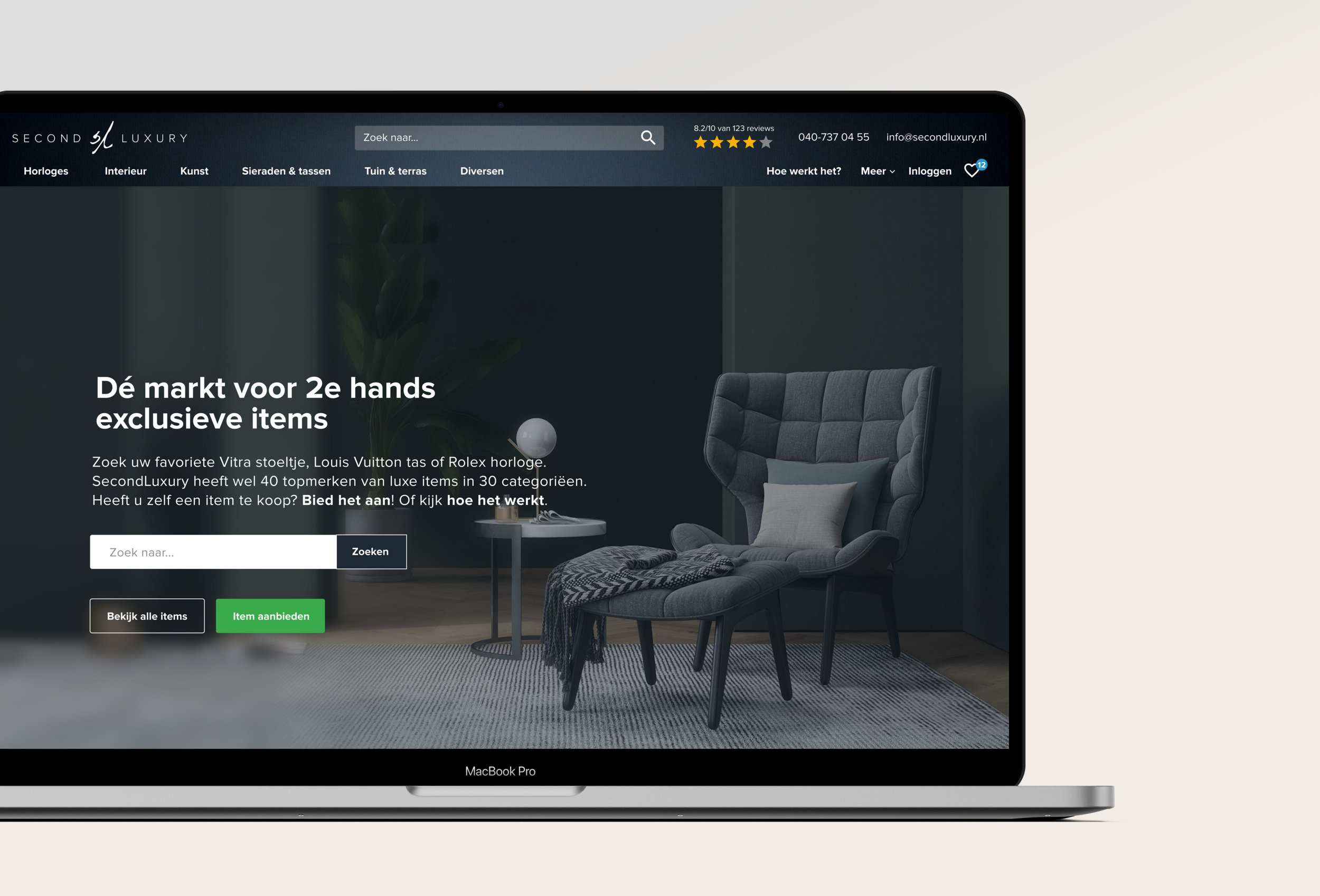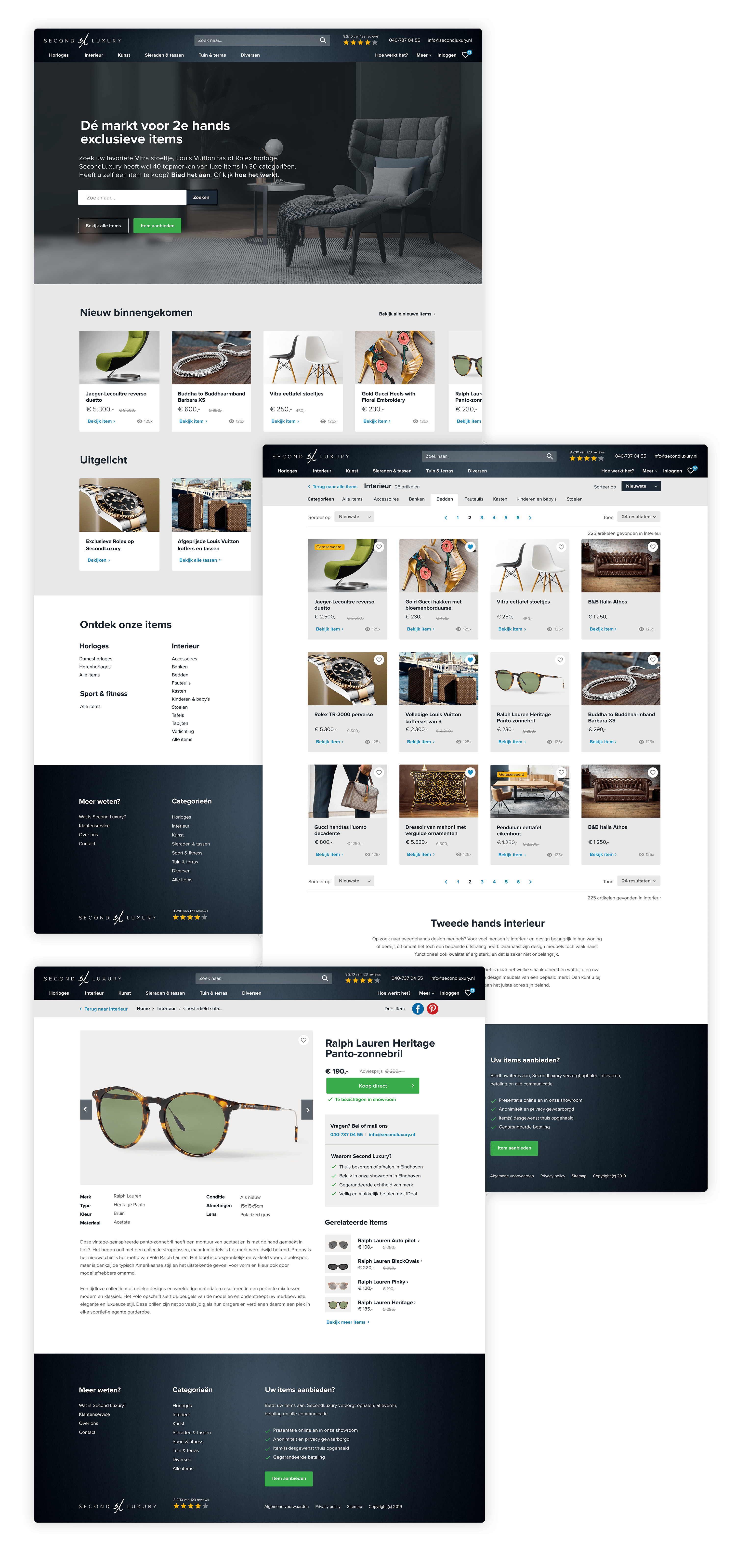SecondLuxury is Marktplaats.nl, maar dan voor luxe merkartikelen, mét veilingklok. Bezoekers kunnen zelf producten aanbieden of zelf meebieden. Wij ontwierpen de huisstijl en het platform, en bouwden de techniek onder de motorkap, inclusief koppelingen met Google Shopping.