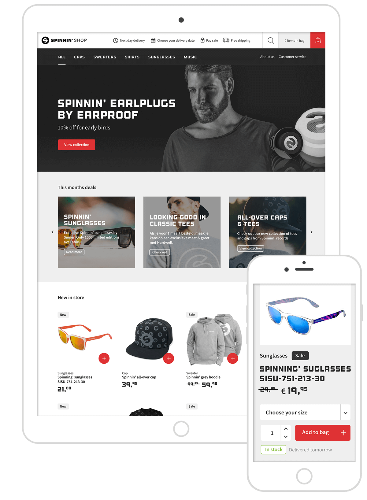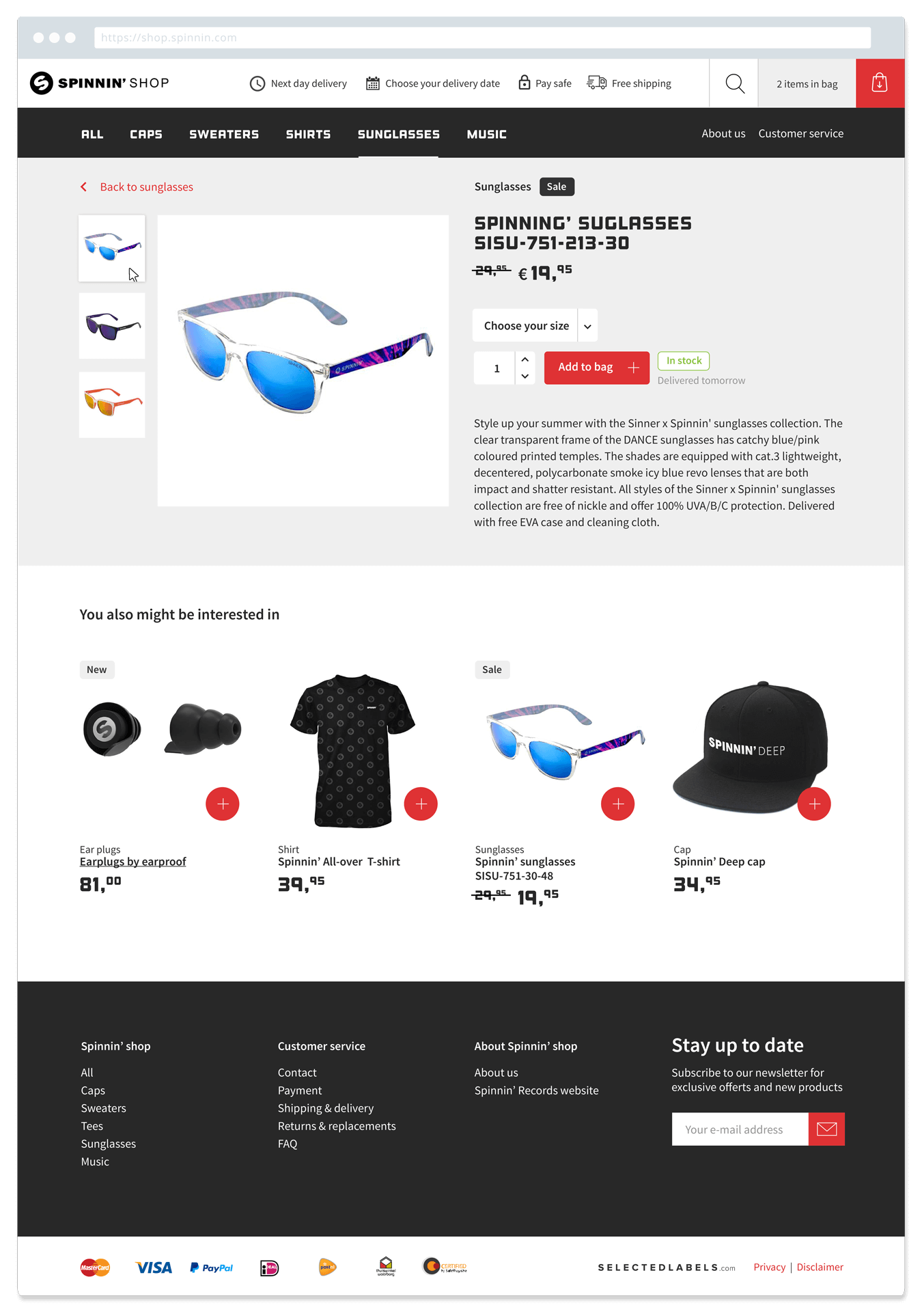 Omdat merchandise direct vanuit de verschillende merken (DJs, festivals, labels) aangeboden dient te worden vroeg Selected Labels ons een universele oplossing te bedenken voor het aanbieden van merchandise vanuit verschillende merken, én met behoud van identiteit van die merken.